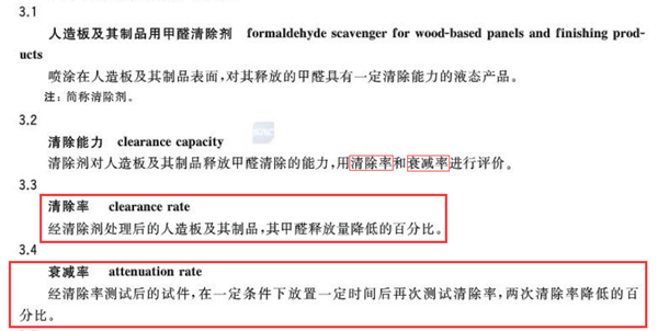 根據國家標準,驗證人造板甲醛清除劑的清除能力有兩個指標非常重要,一個是測定24小時效果的“甲醛清除率”,還有一個測定長期效果的“衰減率”。“衰減率”就是在7天之后,再測一次甲醛清除率,然后把7天后的甲醛清除率與24小時的甲醛清除率作比較,看7天后清除甲醛的效果降低了多少,計算出來的降低比率就是“衰減率”。