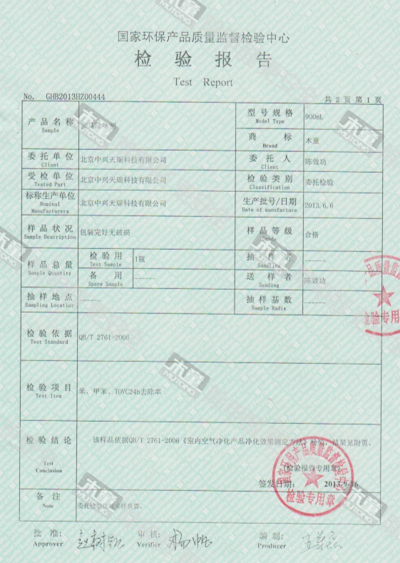 木童家具除味劑效果檢驗報告